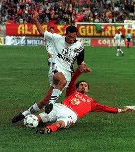 (Em 1992/93 disputando um lance com o defesa do Vitoria SC Taoufick)
